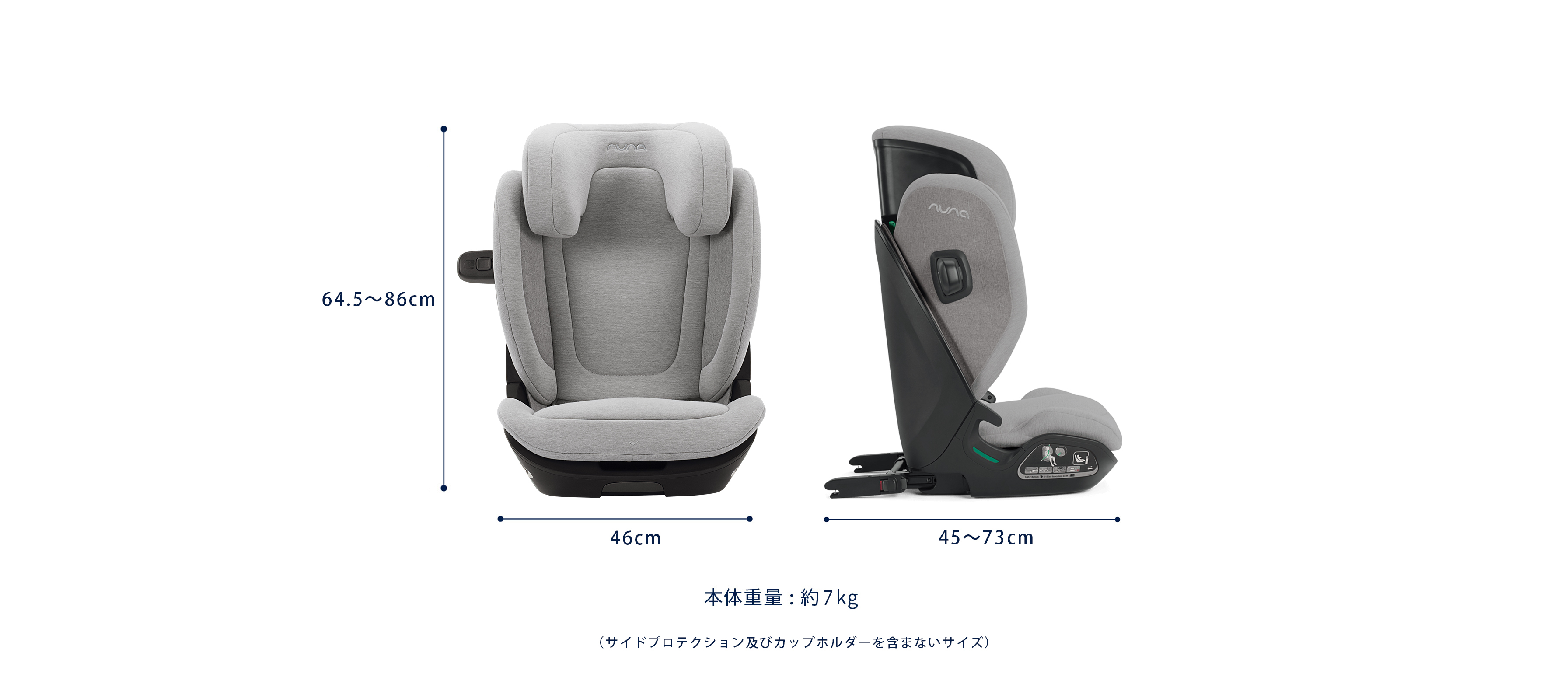 | サイズ/cm | W:46 D:45~73 H:64.5~86cm ■サイドプロテクション及びカップホルダーを含む W:61 D:45~73 H:64.5~86cm |